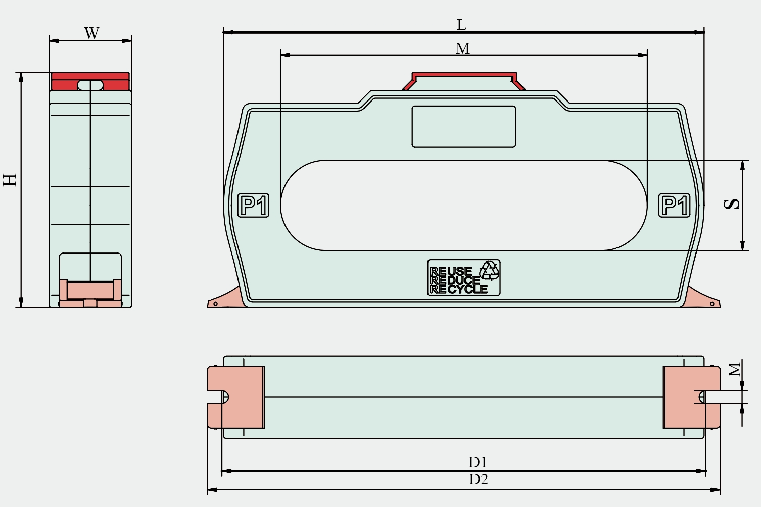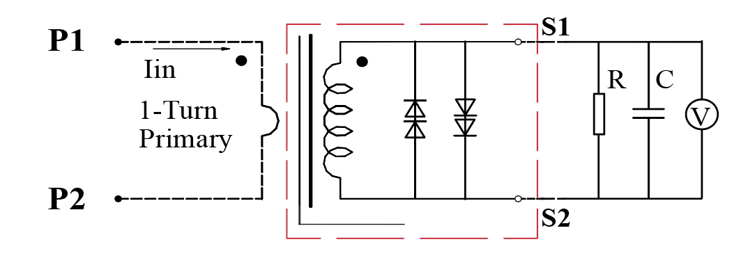 The primary current IP flows in from the P1 terminal and out from the P2 terminal; the secondary current flows out from the S1 terminal and flows in from the S2 terminal.